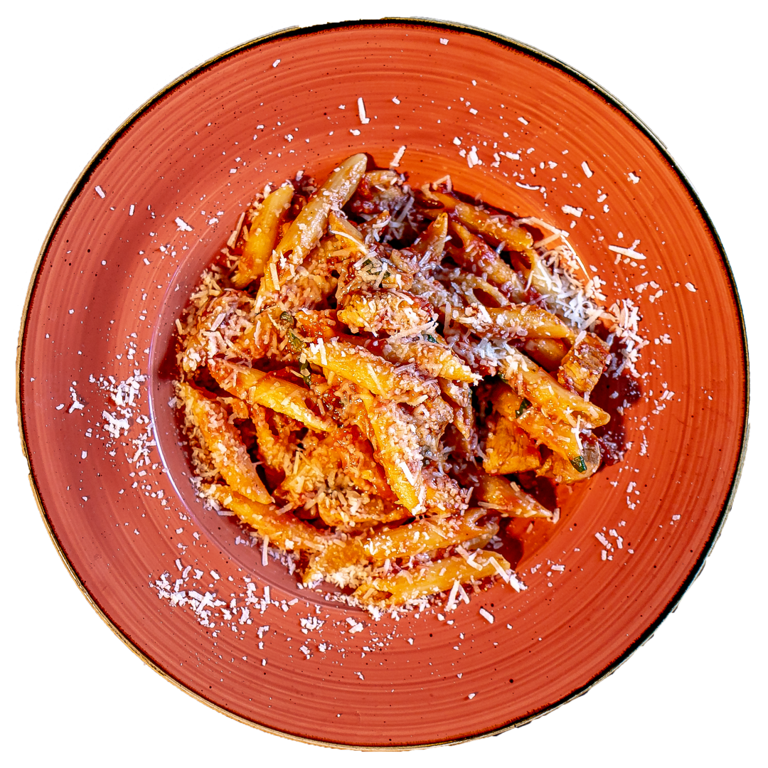 penne, chicken breast, tomato sauce, mushrooms, parmezan
